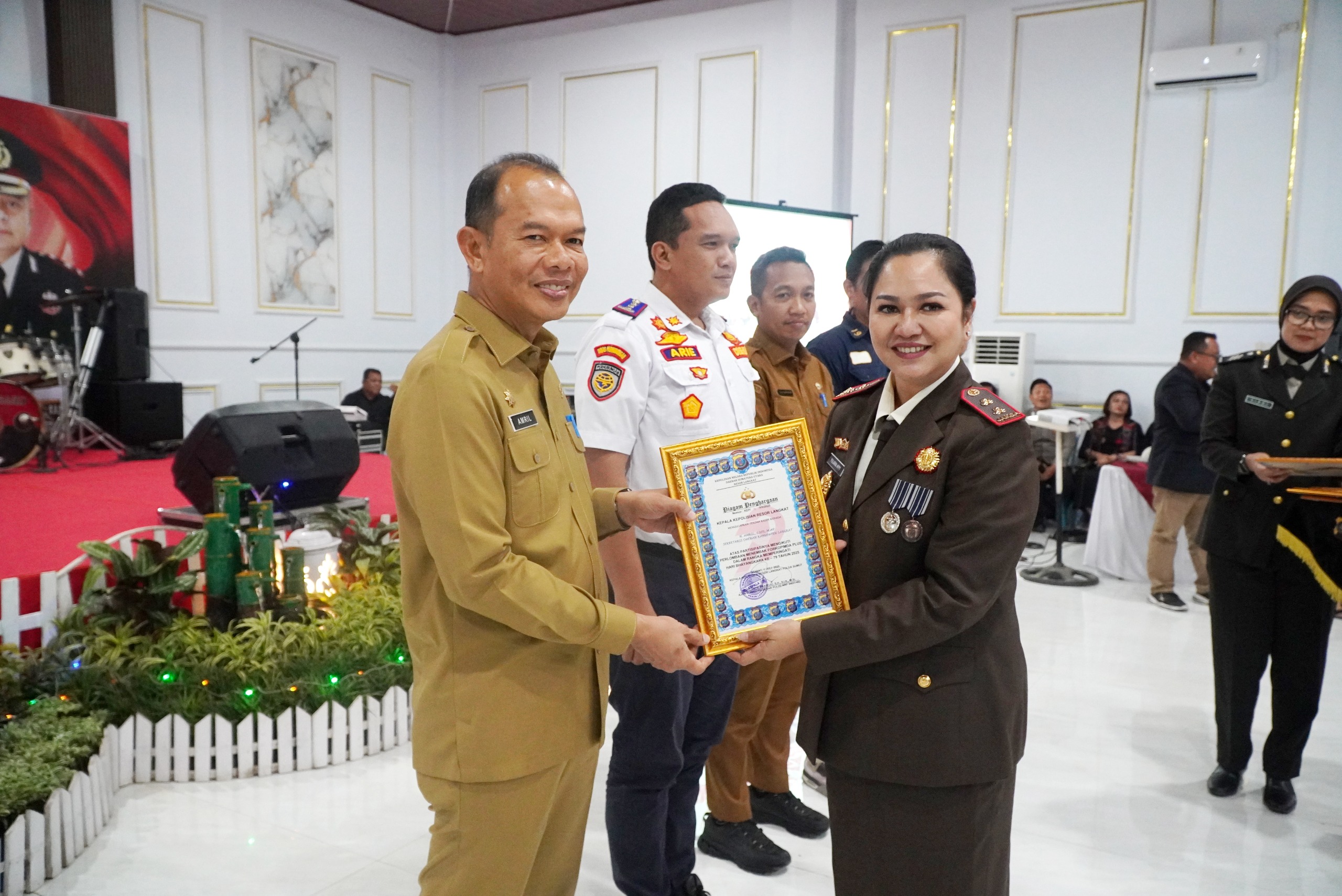 Dirmanews.com, Langkat – Bupati Langkat H. Syah Afandin, SH, melalui Sekretaris Daerah Kabupaten Langkat Amril, S.Sos, M.AP, menghadiri resepsi syukuran Hari Bhayangkara ke-79 yang digelar di Gedung Aula Bhara Dhaksa Polres Langkat, Selasa (1/7/2025).