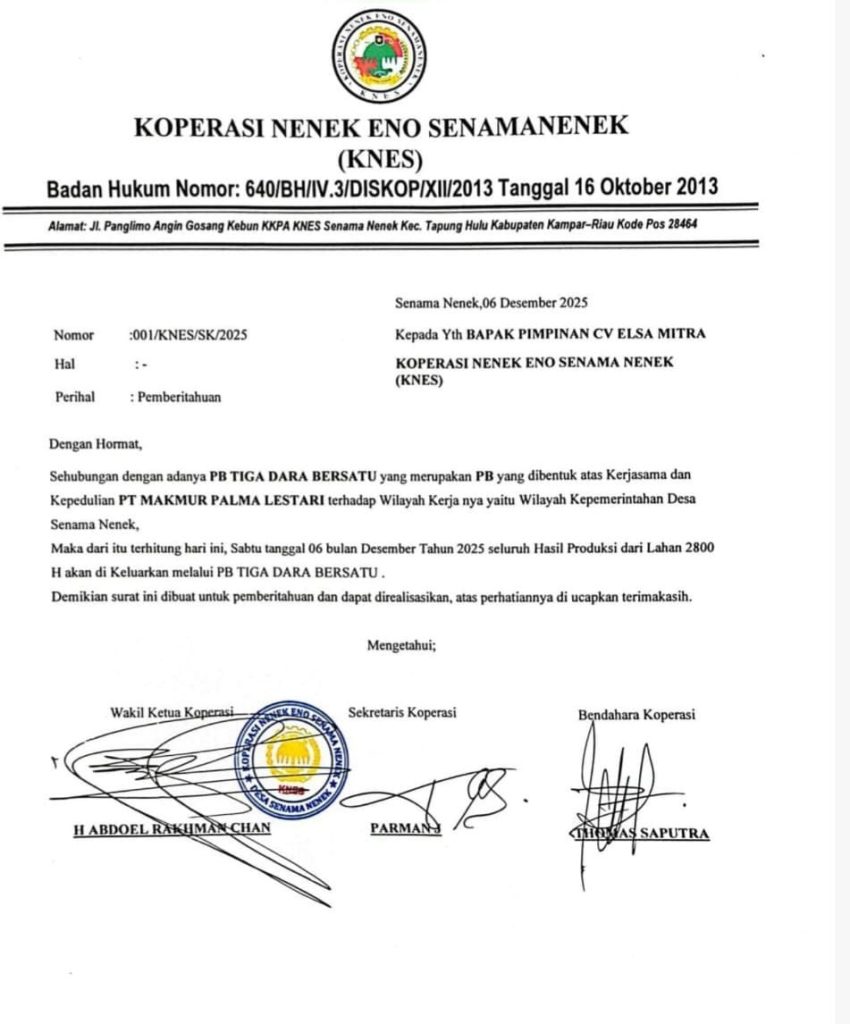 Masalah semakin rumit setelah Kepala Desa Senama Nenek, H. Abdoel Rakhman Chan, yang juga menjabat sebagai Wakil Ketua KNES, mengeluarkan surat resmi kepada pimpinan CV Elsa Mitra Koperasi. Melalui surat Nomor: 001/KNES/SK/2025 tertanggal 6 Desember 2025, ia menyampaikan bahwa seluruh produksi sawit dari lahan ±2.800 hektar akan disalurkan melalui PT Tiga Dara Bersatu—tanpa sepengetahuan KOPOSAN sebagai pemilik sah ±1.700 hektar kebun sawit tersebut.