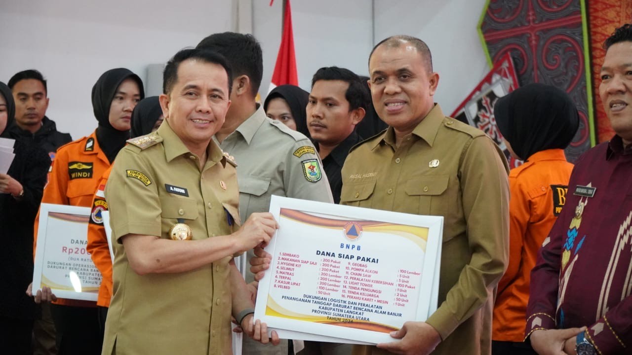 Dalam rapat tersebut, Kabupaten Langkat menerima Dana Siap Pakai (DSP) sebesar Rp200 juta, serta bantuan logistik berupa mesin gergaji rantai, tenda, sembako, selimut, dan kebutuhan dasar lainnya. Bantuan ini diserahkan langsung oleh Sekretaris Utama BNPB kepada Pj Bupati Langkat.